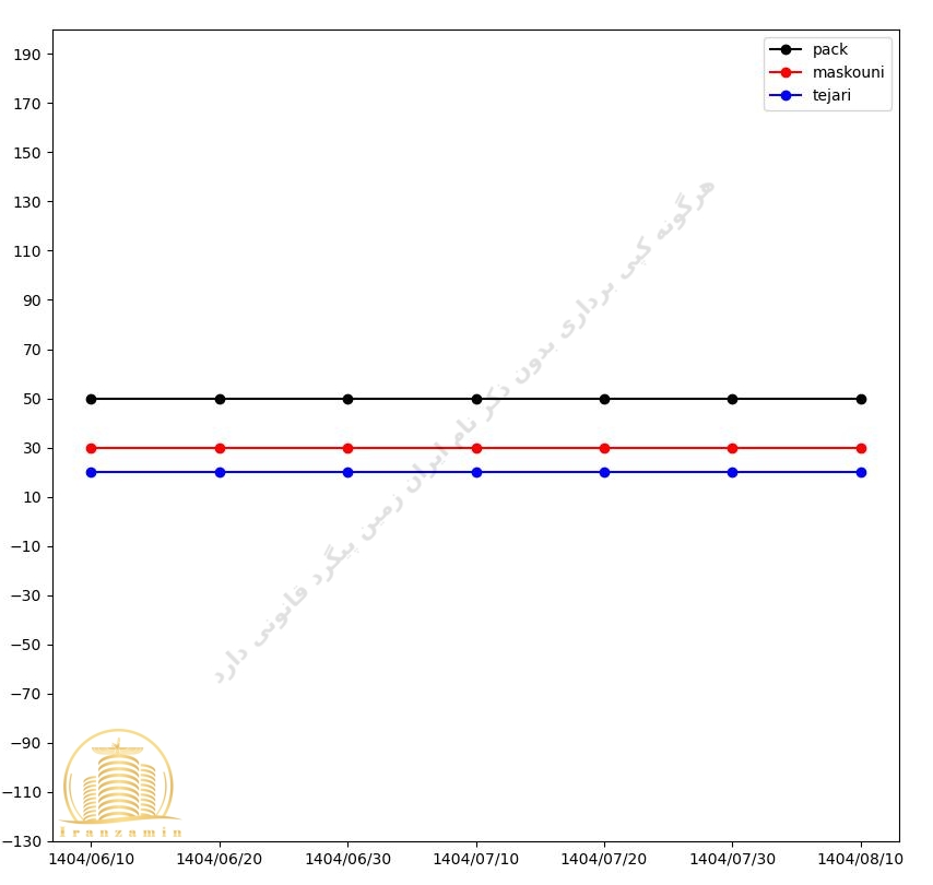 نمودار بالایی شامل تحلیل قیمت امتیازهای تجاری، مسکونی و همچنین پکیج کامل پروژه زاگرس در بازه زمانی دو ماه اخیر میباشد.